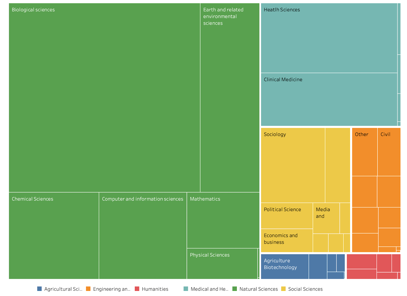Figure 2. Data with metadata describing disciplinary domain, according to the OECD Fields of Science classification, retrieved on July 9th, 2021. For an interactive version of this tree map, with the most current data, please see our Jupyter Notebook [3]