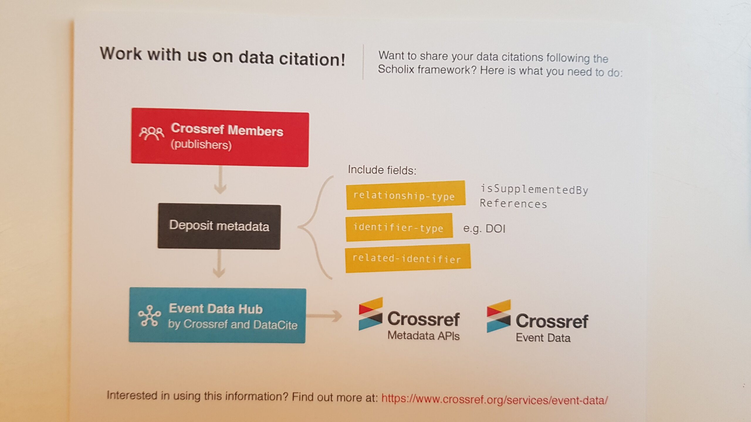 The most important message? You can use your current (metadata) workflows to contribute article-data links. Both Crossref and DataCite are very happy to work with any organization that needs assistance in implementation or optimization of data citation workflows.